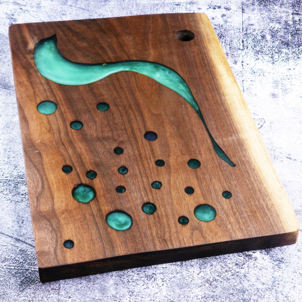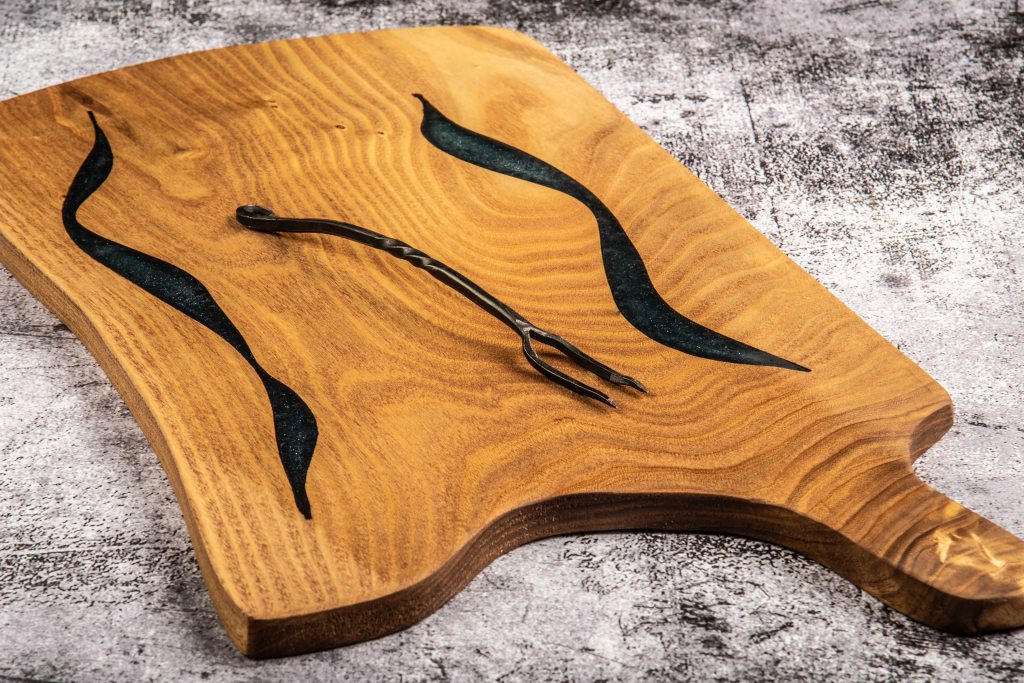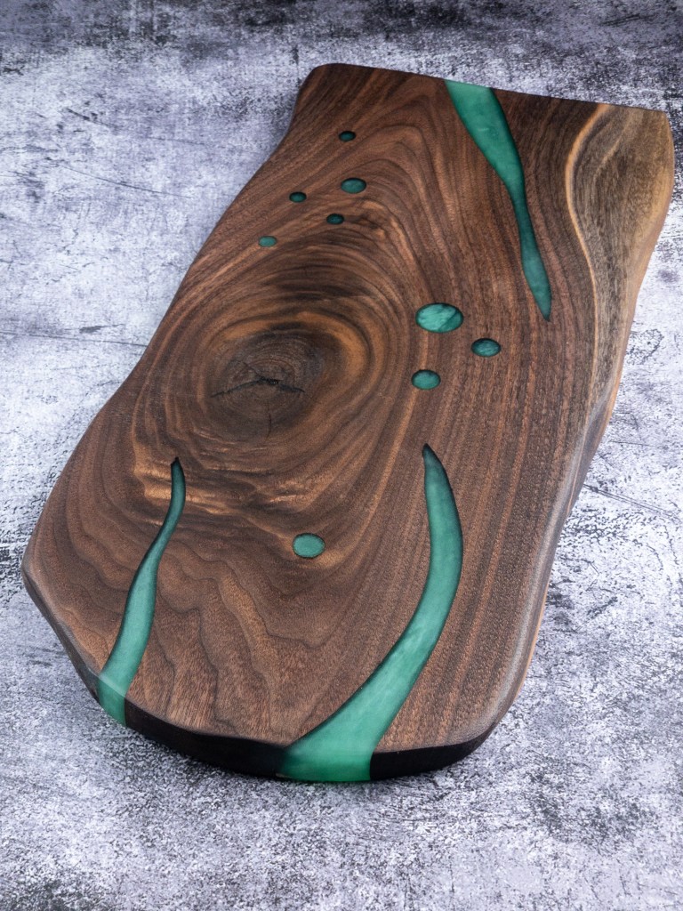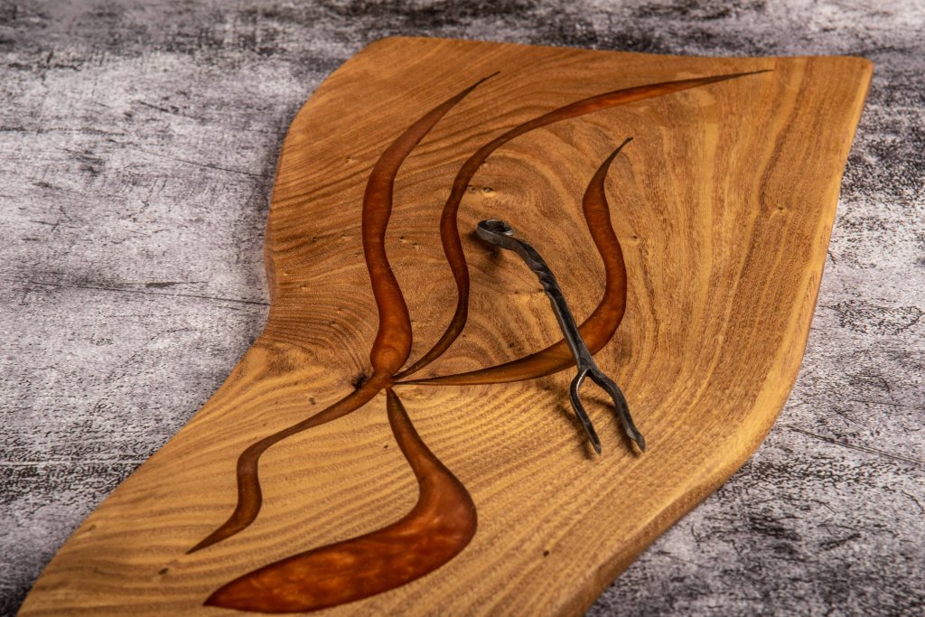 Walnut, Pecan, Osage Orange and many more. Each board is chosen for it’s character, whether its going to be a table or a charcuterie board. Charcuterie boards get their own patterns cut and then filled with colorful epoxy resin. Call us to check our stock or order a custom board.