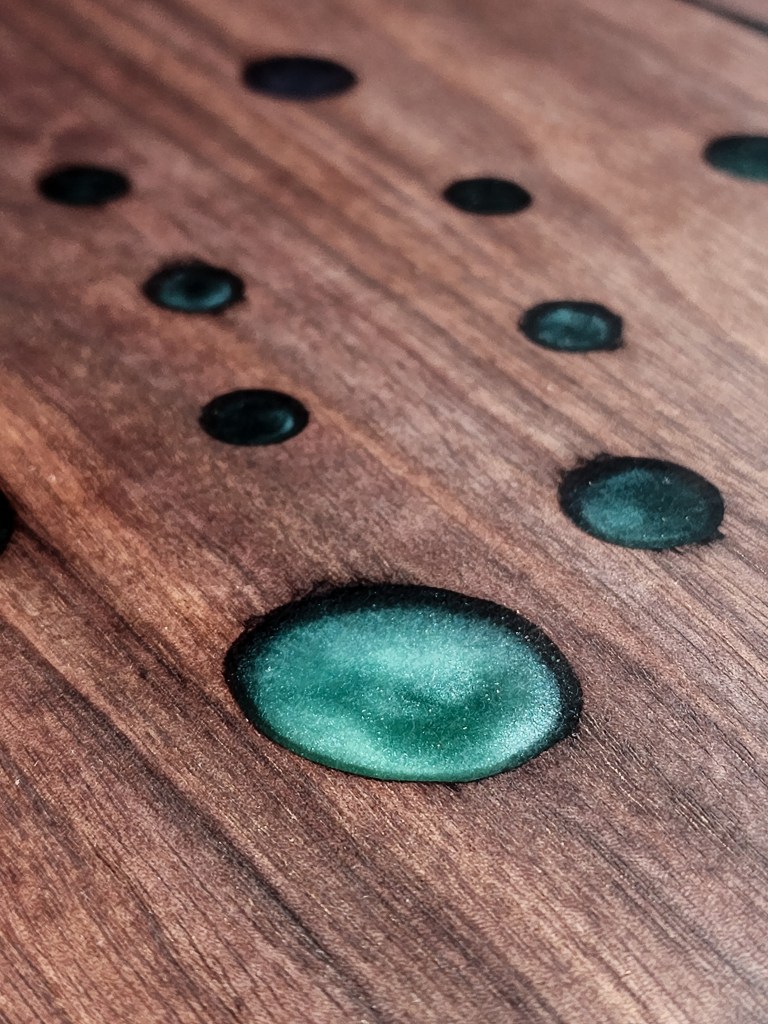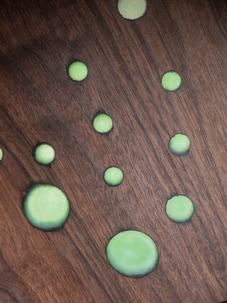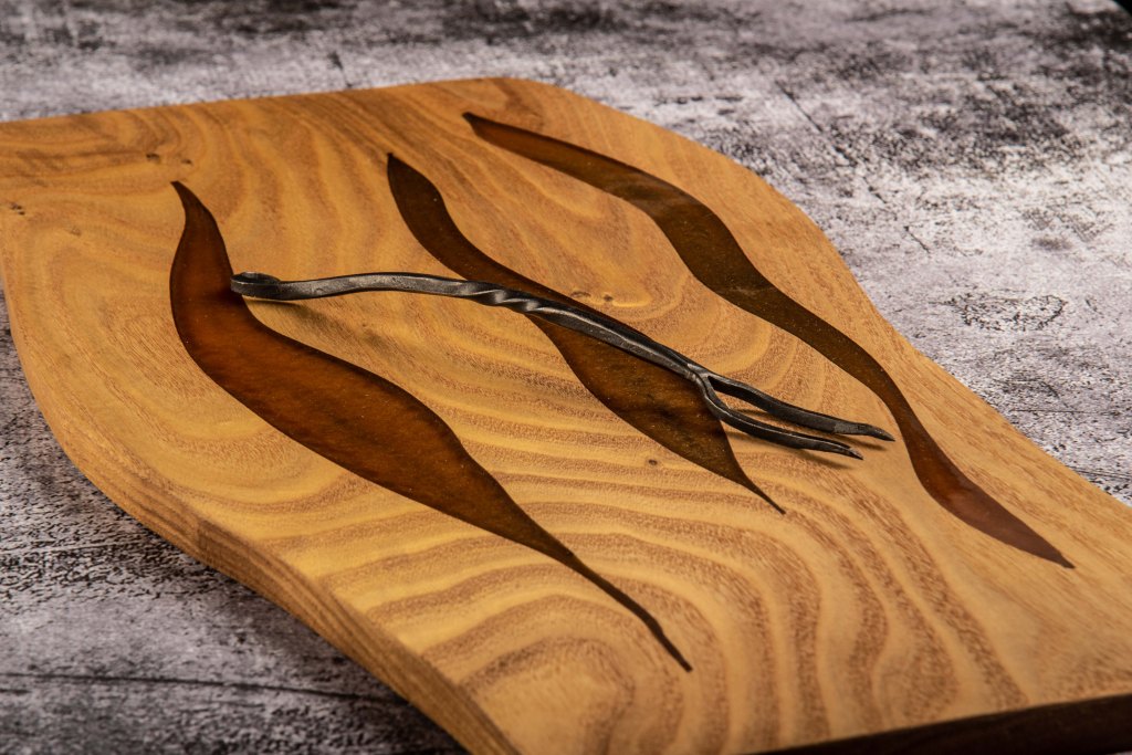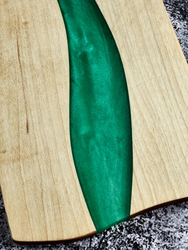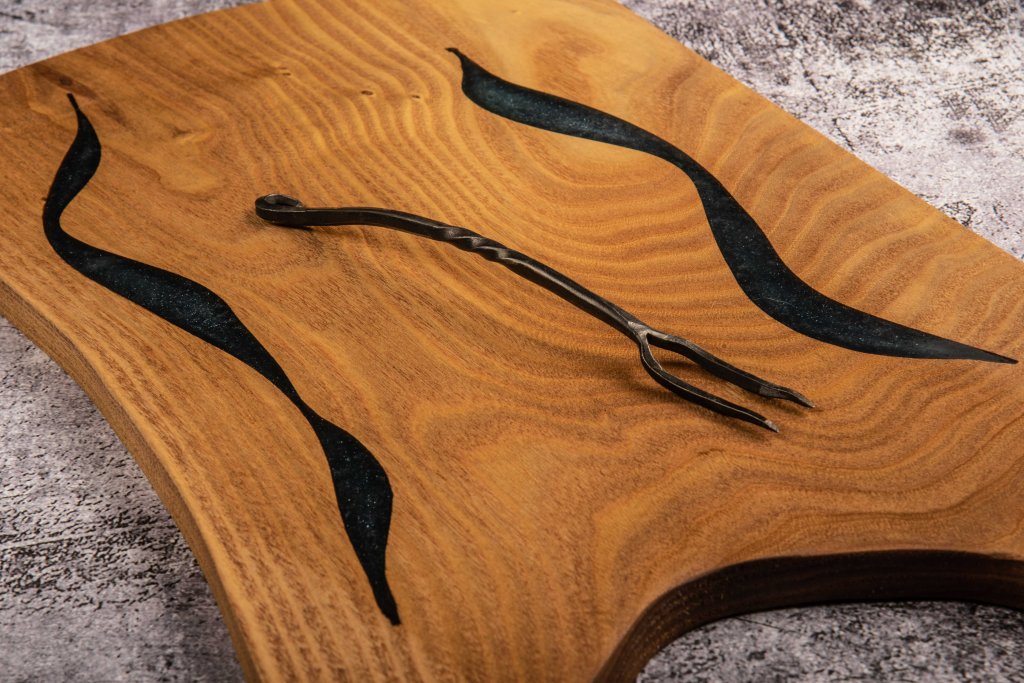Walnut, Pecan, Osage Orange and many more. Each board is chosen for it’s character, whether its going to be a table or a charcuterie board. Charcuterie boards get their own patterns cut and then filled with colorful epoxy resin. Call us to check our stock or order a custom board.